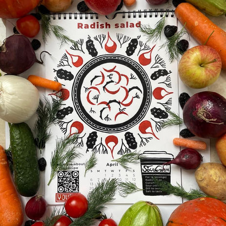 Виставка / перформенс представляє авторський календар діючого військового ЗСУ Юрія Кузьміна, створений у техніці ліногравюри, що поєднує візуальне мистецтво з культурою української кухні.