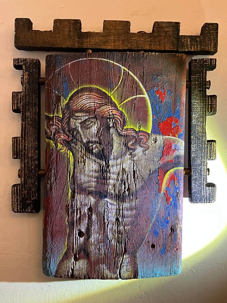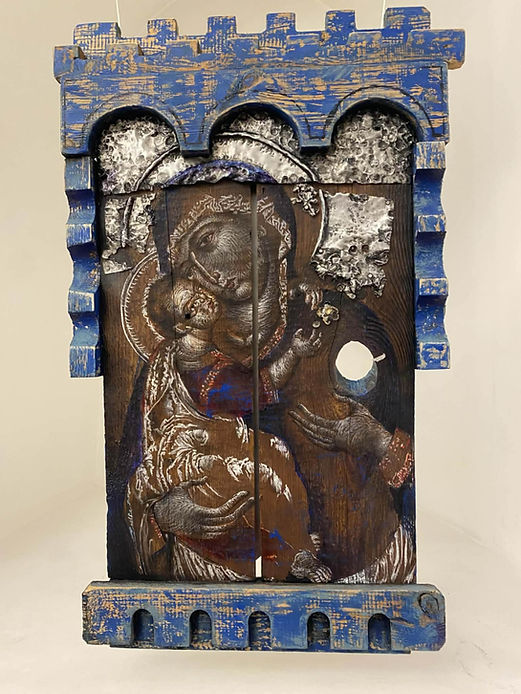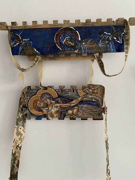 Його роботи часто набувають форми «військових ікон», де традиція сакрального образу поєднується з матеріальністю сучасного досвіду.